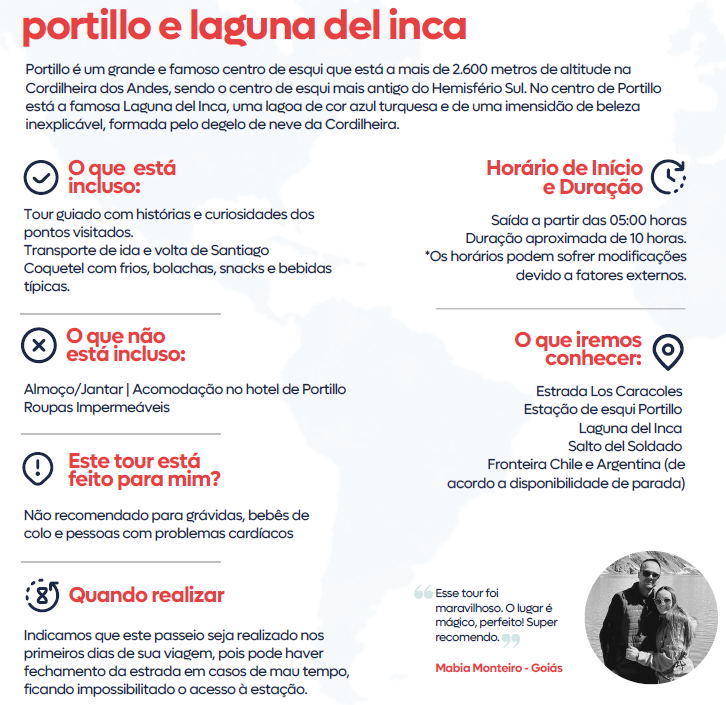 Portillo, no inverno, passa mais dias com o caminho/estrada fechado do que aberto, infelizmente. Também é meu passeio favorito, mas quando tem nevasca na Cordilheira dos Andes, as autoridades chilenas fecham as estradas para a segurança dos turistas. E se você não sabe dessa informação, você acaba deixando para o último dia e corre o risco de não conseguir realizar o passeio.
