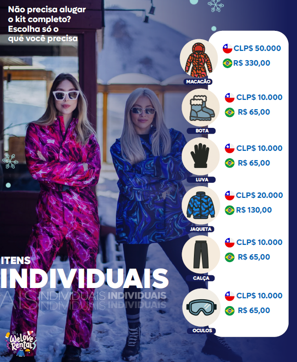 - E o melhor: a We Love Chile tem rental próprio, SIIIM bicha, o WE LOVE RENTAL. Os casacos são lindos, estilosos e funcionais. O aluguel é por ordem de chegada, então já chega com foco. E sim, a van para no rental no MESMO DIA do passeio, você não precisa sair de casa antes só pra isso.