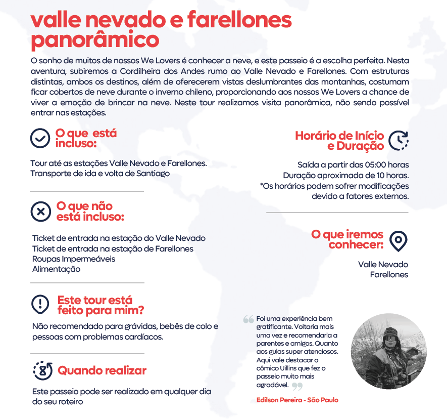 Ah! E se o seu sonho é esquiar no Valle? Já se prepara: esse não é o passeio pra isso. A gente só fica lá por volta de 1h10. Então, se quiser passar o dia todo, esquiar, aproveitar mesmo, o nome do seu rolê é: Valle Nevado Full Day.